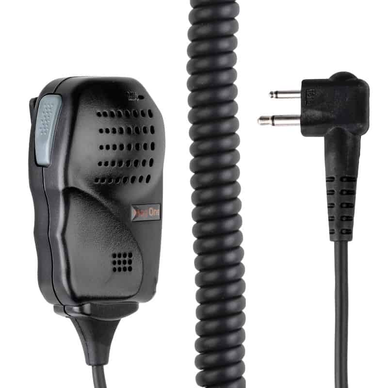 This Remote Speaker Microphone (RSM) includes a coiled cord, submersible safety rating and push-to-talk switch.